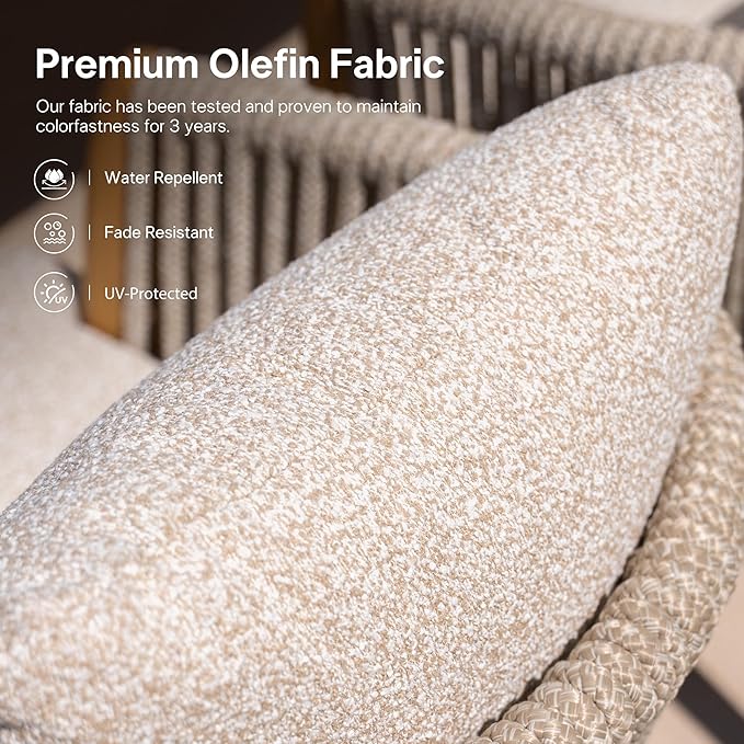 - Olefin Cushions & Pillows: This patio dining set includes plush seat cushions and lumbar pillows made from premium 100% Olefin fabric, offering excellent 7-Grades fade resistance, water repellency, and lasting comfort.