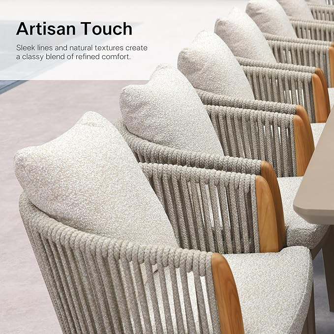 - Teak & Rope Accents: The outdoor dining chair features smooth teak wood armrests and durable hand-woven 0.6" thickened rope backrests that add natural elegance and strong support.