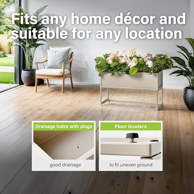 - ✅ Efficient Drainage - Each indoor or outdoor planter box stand features an effective drainage system, including two drainage holes with a plug, ensuring your plant beds outdoors receive the perfect amount of water without the risk of overwatering.