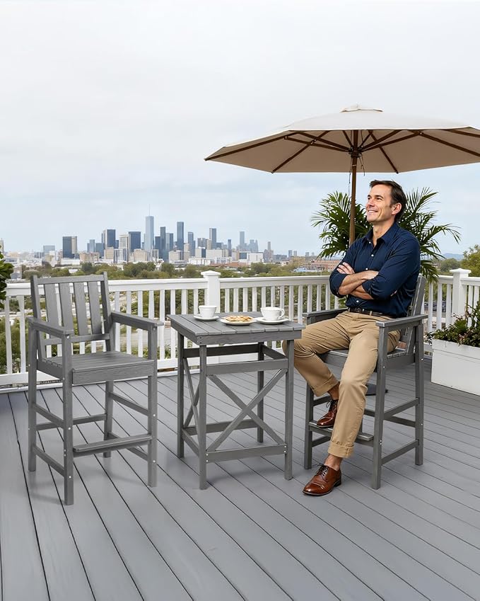 - 【Storm-Ready Quick-Dry】 Slatted HDPE seats and tabletop shed water quickly, so your outdoor bar set dries in minutes after a heavy downpour; keeps surfaces clean and ready for use — perfect for poolside and patio setups.