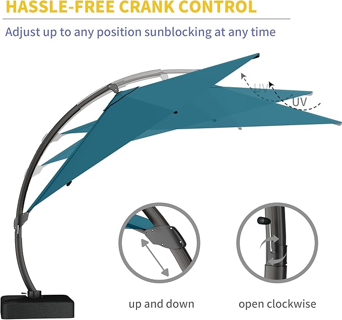 - 【360° Rotation & Infinite Tilt for Full Sun Control】Maximize shade coverage with smooth 360° rotation and precise infinite tilt adjustment. Easily block sunlight from any angle—perfect for poolside relaxation, patio dining, or backyard gatherings.