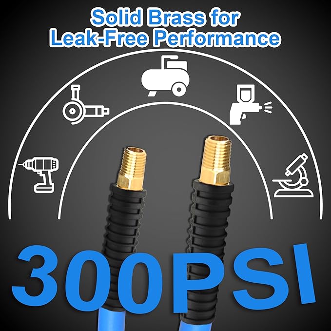 - 🎄PREMIUM HYBRID AIR HOSE: The commercial 3/8" x 50' hybrid polymer hose has a working pressure of 300 PSI and features 1/4" NPT solid brass connections allowing it to connect to air tools. It's all-weather flexible with a temperature range of -4 to 140℉ and provides full control without flow cut-off or hose entanglement.