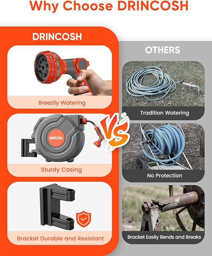 - 【20000+ Times Test & UV and Freeze Protection 】DRINCOSH’s retractable hose reel has been rigorously tested over 20,000 retractions, proving its exceptional durability and reliability. Additionally, the outer casing features a UV and freeze-resistant materials, extending its lifespan while maintaining its appearance and performance year after year
