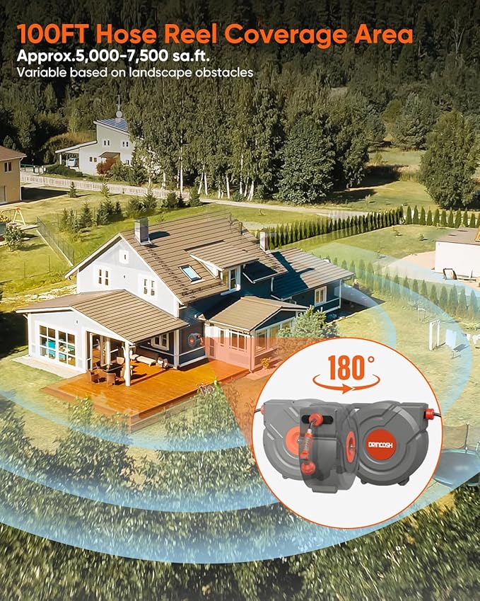 - 【180° Swivel Bracket & 100 ft Hose Coverage】 DRINCOSH garden hose reel features a 180° swivel bracket, providing flexible coverage across your garden or workspace without repositioning. With a 1/2 inch 100ft hose, it efficiently covers an area of 5000 to 7000 sq. ft.(Variable based on landscape obstacles), making watering large areas easy and convenient