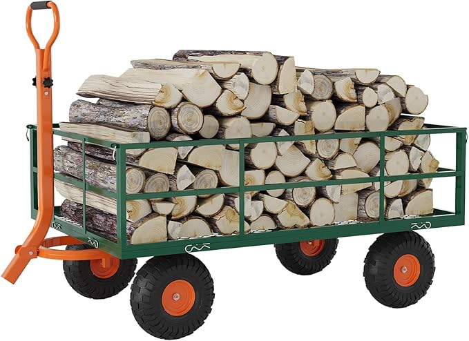 - [Heavy Duty 1400LB Capacity] This steel garden cart boasts an impressive 1400-pound load capacity, constructed with reinforced Q235 steel and three support beams. Perfect for transporting soil, firewood, gardening tools, and other heavy items with exceptional durability and stability.