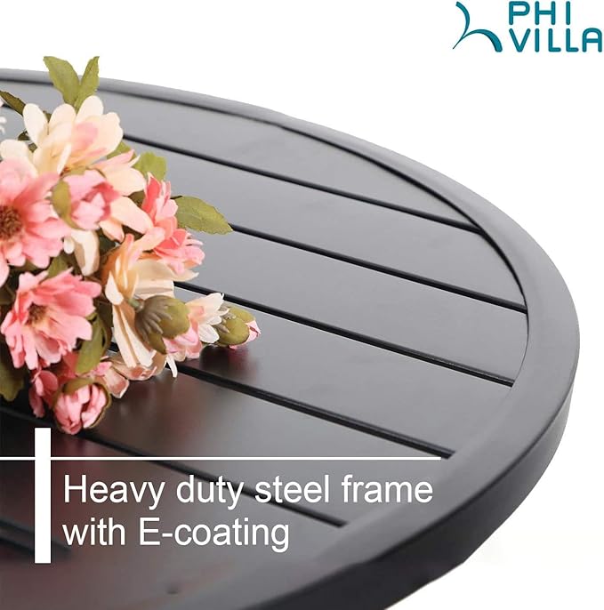 - Metal Bistro Table - Small round coffee table with thick slatted metal tabletop, rust and weather resistant. Powder-coated finish, can be easily cleaned up with damp cloth and water. Skid resistant feet for uneven ground and against floor scratching. Dimensions: Φ28" x 28.7”H.
